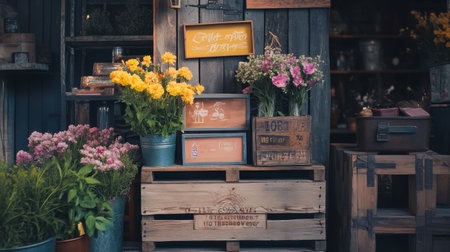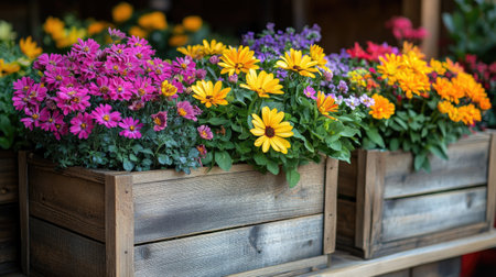 Vibrant flowers add a touch of beauty to wooden planters, creating a cheerful display at a market stall