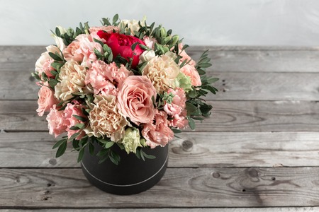 luxurious and elegant bouquet of roses and Other colors flowers on wooden background, copy space.