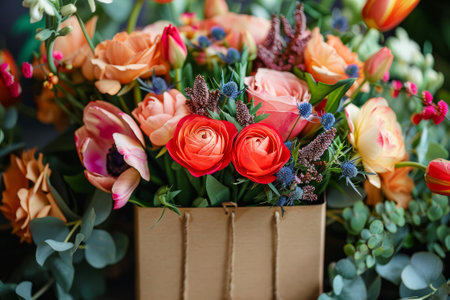Vibrant fresh flowers arranged in a cardboard delivery box create a cheerful display suitable for gifting with space for a personal note.