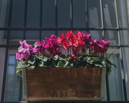 Cyclamen persicum, persia violet in a wooden pot on the sill of a window