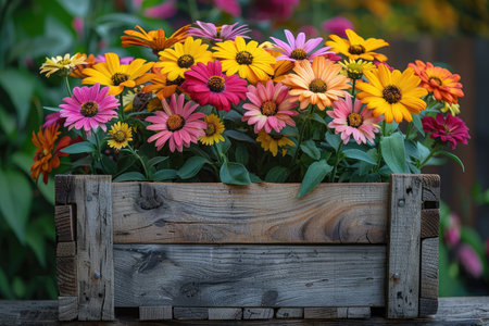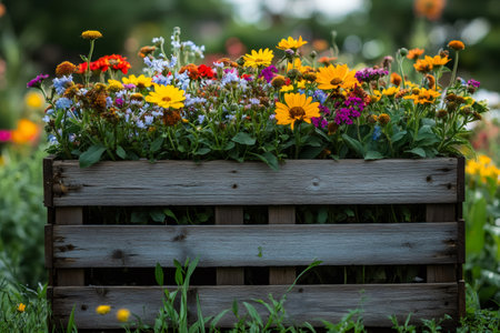 Vibrant blossoms add a touch of color to a weathered wooden crate, creating a charming garden display
