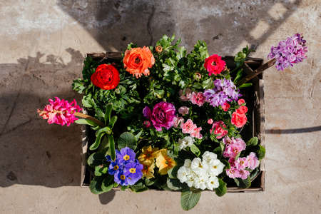A wooden crate filled with a variety of vibrant and colorful flowers, showing a burst of natural beauty.