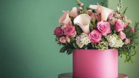 A pink round box with flowers, including roses and calla lilies, is placed on a table against a green background, depicting the interior of a flower shop. This image was captured through professional photography. --chaos 30 --ar 16:9 --v 6.1 Job ID: 780c8cff-0dd7-4308-9f84-379b6f54e90b