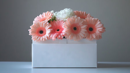 A chic gift box wrapped in white paper and topped with fresh blush-colored gerberas and matching carnations, on a minimalist background
