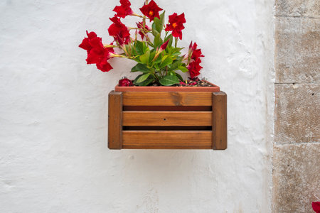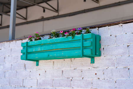 wooden planters for flowers on the wall of the house. decoration of the yard in the house.