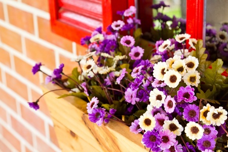 Beautiful flowers blossoming roses colorful in three boxes outdoors on brick chimney on blue sky