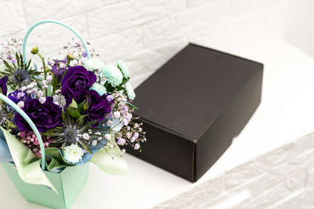 Image of arrangement with hydrangea, eustoma, spray yellow and violet roses, pink carnations, eucaliptus, waxflowers. Lovely Mixed flowers bouquet in black envelope box on the turquoise wooden table
