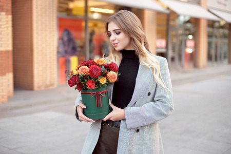 Caucasian fashion woman standing on the street near storefront shop windows holding flower-box with happy smile