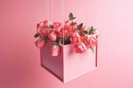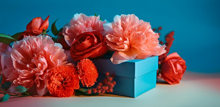 An AI generated illustration of Floral arrangement in front of a vibrant blue box adorned with flowers