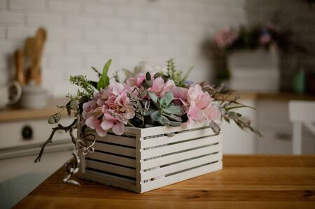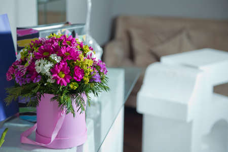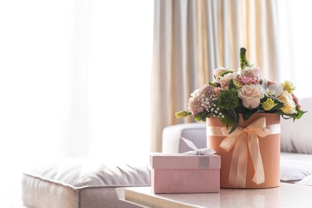 Flowers as a gift to your beloved woman. A gift set of boxes with flowers in a beautiful interior on the background of a sofa. The flower room. A box of flowers for Mothers Day.
