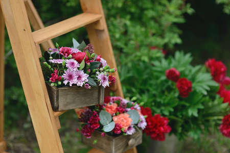 floral arrangement in the garden on a wooden staircase bright beautiful bouquet