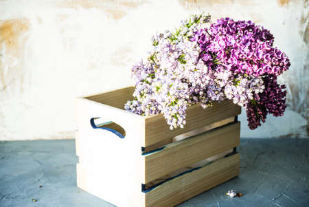 Beautiful bunch of lilac flowers in a wooden box on rustic background with copy space
