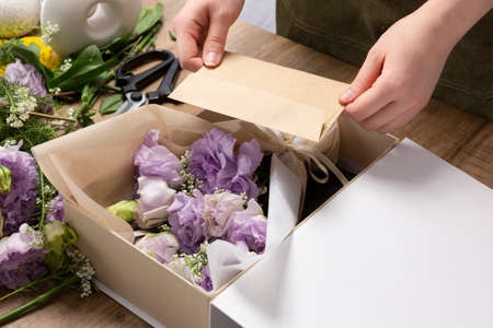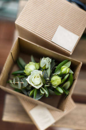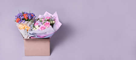 Many colorful bouquets of flowers in a cardboard box. On a light background. Holiday concept. High quality photo