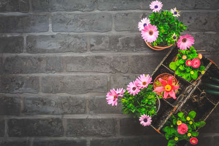 Tool box withpotted spring flowers, gardening tools on black stone background - gardening and spring concept, planting flowers