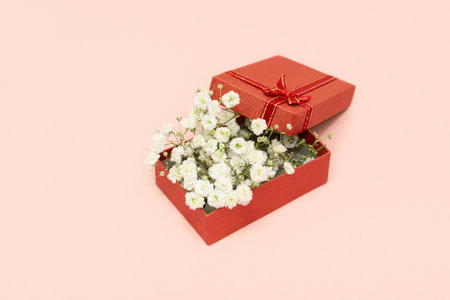 Beautiful white flowers in red gift box on orange background. Mother's day gift box with beautiful white flowers. Gift box with white flowers bouquet