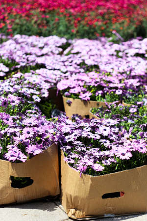 Assortment of colorful chrysanthemum flowers in garden. Daisy flowers in planting pots. Summer and autumn nature background outdoors. Purple and yellow Chrysanthemum blossom in box