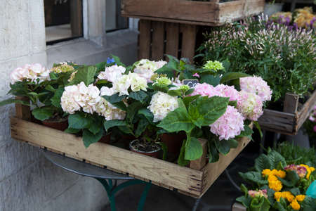 Artificial hydrangeas and geraniums in wooden boxes near Covent Garden