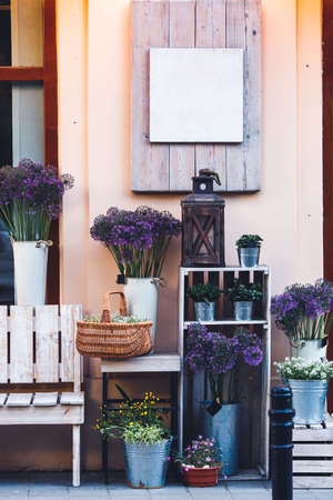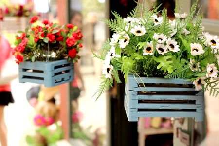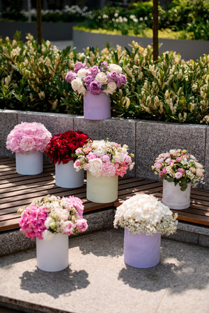 Colorful flowers bouquets in hat boxes on the streer. Variety of flowers