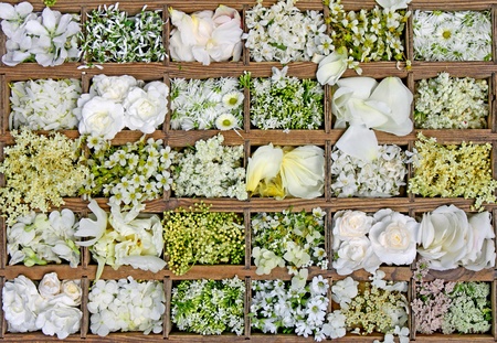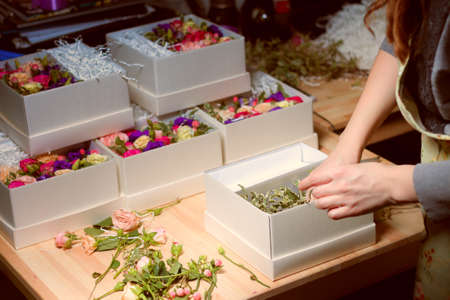 Beautiful and cute flower composition in a little box on the white background. Top view