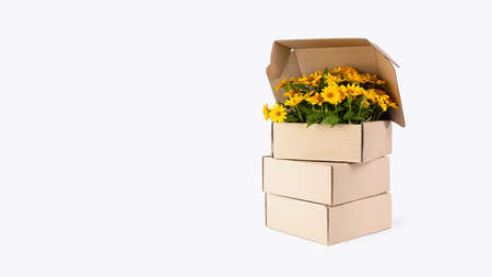 Bouquet of Silphium flowers in a cardboard box. Silphie plant fibers use for made eco-friendly package.