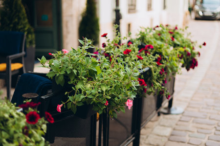 Terrace cafe with flowers in pots. Crimson pink blooming Petunia flowers. Outdoor street cafe tables ready for service.
