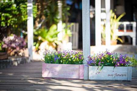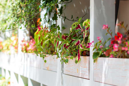 Facade Wall Decorated with Garden Flowers in Wooden Boxes closeup Outdoors