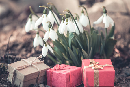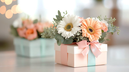 Beautiful delicate pink and white flowers in hat gift boxes stand on the sunny windowsill of the bedroom.