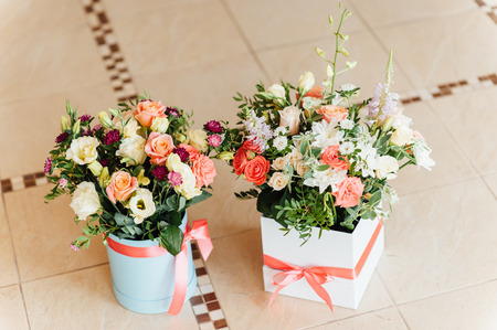 Two Beautiful bouquet of bright flowers in basket for wedding ceremony