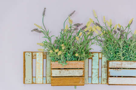 wooden planters for flowers on the wall of the house. decoration of the yard in the house.