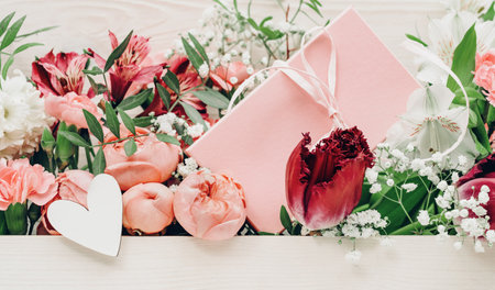 Spring or summer pink and white garden flowers between white wooden background. Heart and pink gift box greeting card. Carnations hyacinth roses alstroemeria primrose floral arrangement.