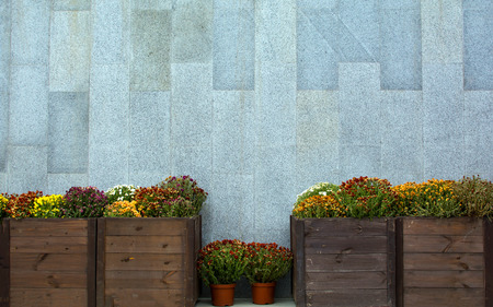 Blossoming white chrysanthemum flower in wooden pot box stand on wood bench near residential or office building against wall and window. Plant decoration of urban city street.