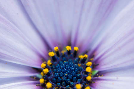 A stunning macro photograph of a purple and white gazania or daisy-like flower, focusing on the vibrant yellow stamens and the intricate details of its center. The sharp focus and beautiful lighting highlight the delicate textures and patterns of the bloom.