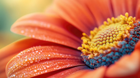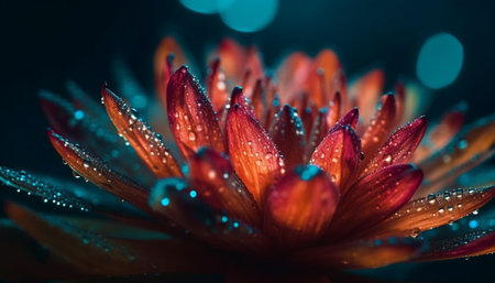 This macro photography showcases a blooming flower's vibrant petals adorned with crystal-clear water droplets.