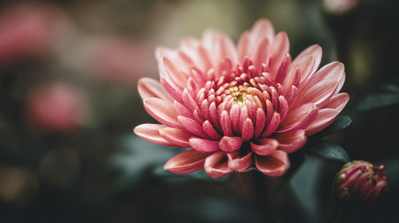 Elegant pink chrysanthemum flower in full bloom, with a bud nearby.