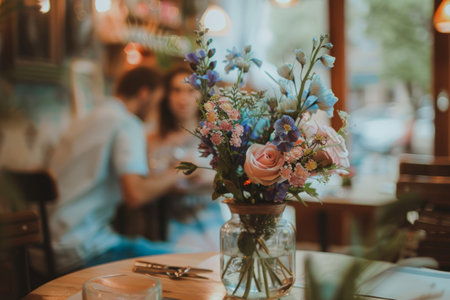 Vibrant wildflower bouquet in jar vase with coffee and pastry on cafe table. That the image is generated using AI.