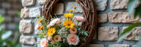 Rustic floral wreath on stone wall with vibrant yellow and pink blossoms. That the image is generated using AI.