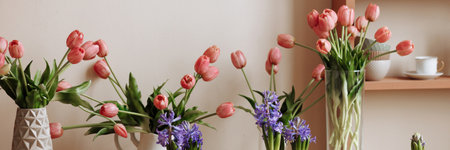 A cozy shop interior with decorative flower arrangements in vases and pots, creating a warm and inviting atmosphere, perfect for home decor and lifestyle content.