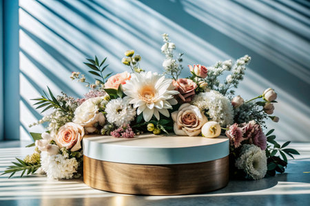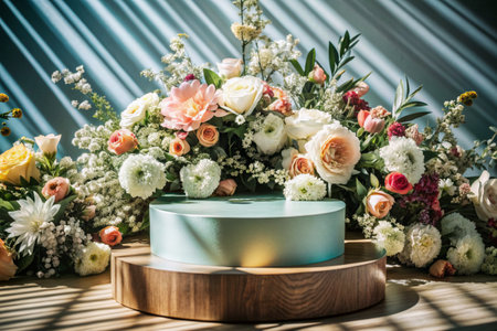 Minimalistic background for product demonstrations. A modern bright podium with flowers. Creative design for product presentation.