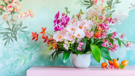 A stunning floral arrangement featuring various orchids and colorful tropical elements, set against a soft pastel backdrop for a modern decor look.