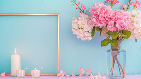 This lovely arrangement features a beautiful bouquet of pink hydrangeas beside candles, creating a serene ambiance against a vibrant blue backdrop.