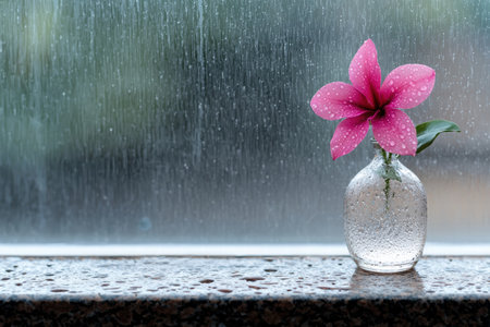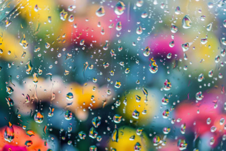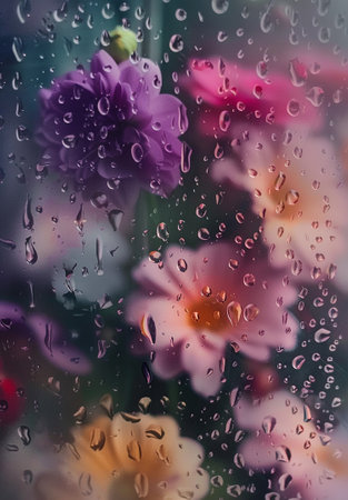 A beautiful view of rain droplets clinging to a glass window, with a soft-focus backdrop of vibrant flowers, creating a calming and refreshing atmosphere in nature.