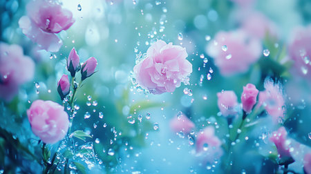 A close-up of delicate pink flowers with water droplets, captured in vibrant detail. The soft lighting and rich colors create a refreshing and natural aesthetic, perfect for floral themes.