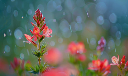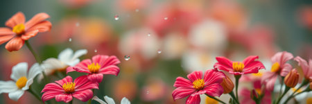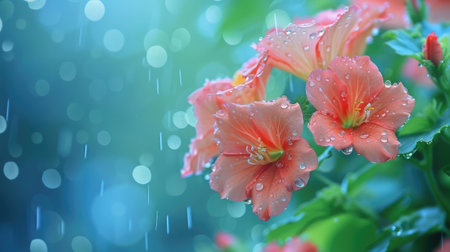 An enchanting scene of vibrant flowers illuminated by gentle rain, showcasing colorful petals adorned with dewdrops, creating a serene and refreshing nature experience.