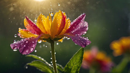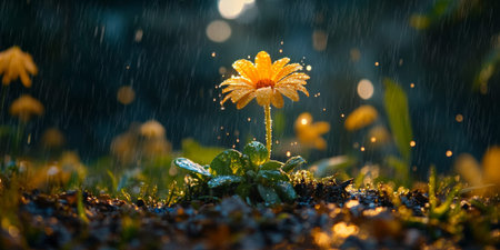 A captivating close-up image of a yellow flower adorned with sparkling water droplets, showcasing nature's beauty under a soft atmospheric rain and glowing sunlight.