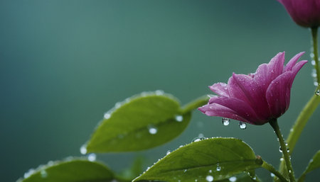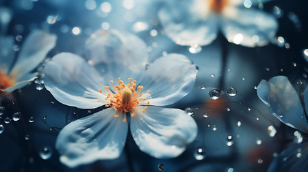 Delicate flower petals are highlighted with shimmering water droplets, creating a serene scene filled with soft lighting and intricate details in nature.