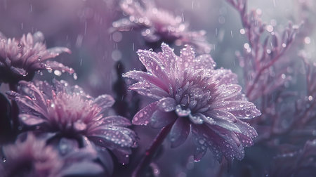 Delicate Beauty A Cluster of Purple Daisy Flowers Glisten Under a Gentle Rain Shower