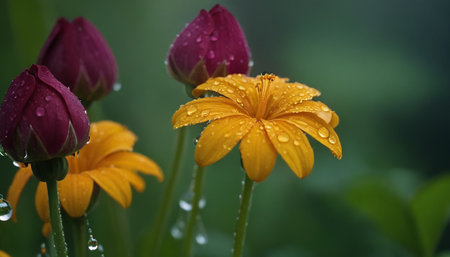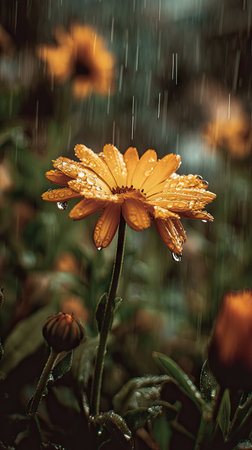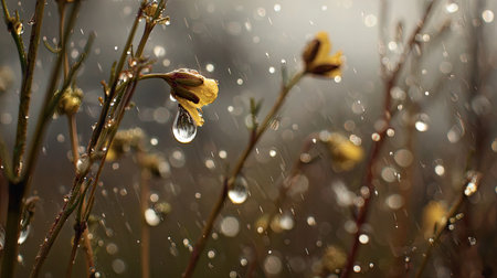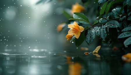 Vibrant yellow flowers stand out against a soft-focus background, with droplets of rain falling gently, creating a serene, refreshing scene.
