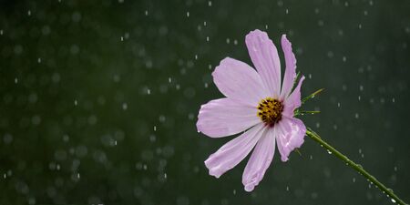 Beautiful pink flower in the rain against a blurred natural background. Copy space.