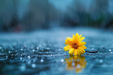 A vibrant yellow flower amidst raindrops reflecting on a wet surface