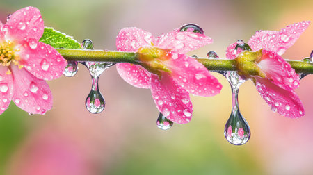 A stunning close-up of delicate pink flowers adorned with dew drops, creating a beautiful and vibrant display in soft morning light surrounded by nature.